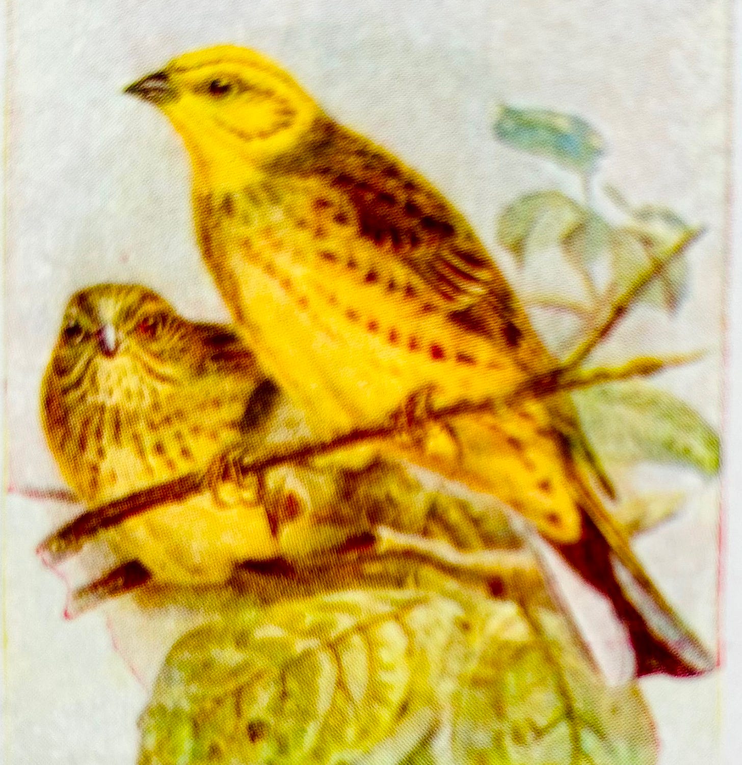 We watched their zesty brilliance every time we passed their field. And there they were again in the old cloth-bound copy of the Observer’s Book of British Birds at our rented cottage: the ‘yellow bunting’ page standing out among all the other finches. (These days bird books have refined the definition, and clearly separate the finches from the buntings.) Charmed as much by the pocket-sized antique book’s faded watercolours and tiny script I discovered from the author Ms S. Vere Benson, ‘Hon. Sec. of the Bird Lovers’ League’ (1952) that the yellowhammer is a seed eater that also feeds on insects. Relying these days on set-aside, seed-rich areas, and winter stubble on weedy arable land, yellowhammers also consume mayflies, grasshoppers, lacewings, and even worms and snails. All these food sources are fragile, and sensitive to agriculture; the survival of the whole ecosystem depends on less use of weedkillers and pesticides. Sadly, since 2002 yellowhammers have been on the red list for threatened species.