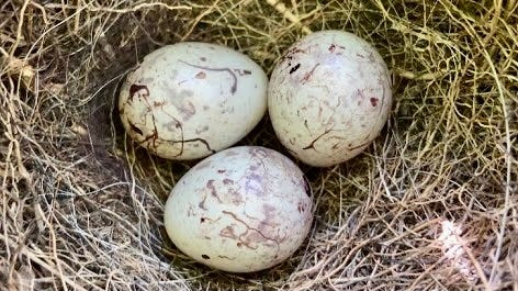 Five eggs, pen-scribbled o'er with ink their shells